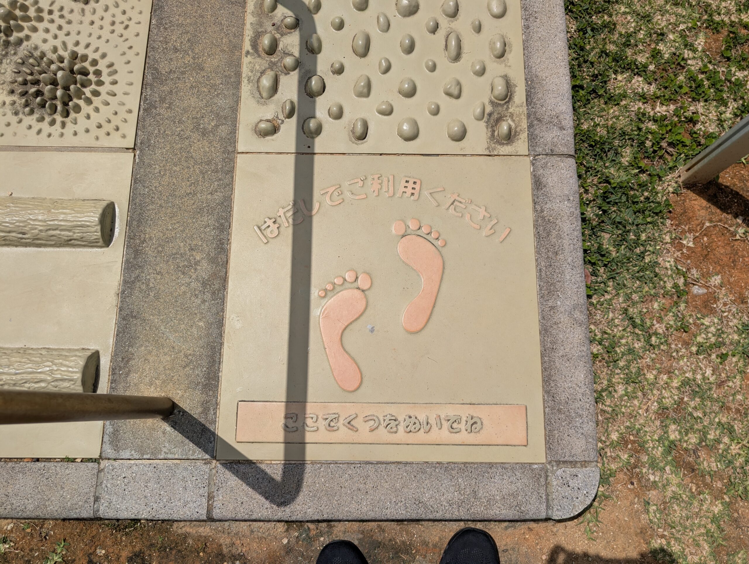 さあ、靴を脱いで挑戦です!タイルには親切に足跡が刻まれています。